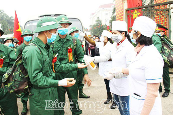 Phát khẩu trang cho tân binh tại lễ giao, nhận quân tại huyện Yên Mỹ