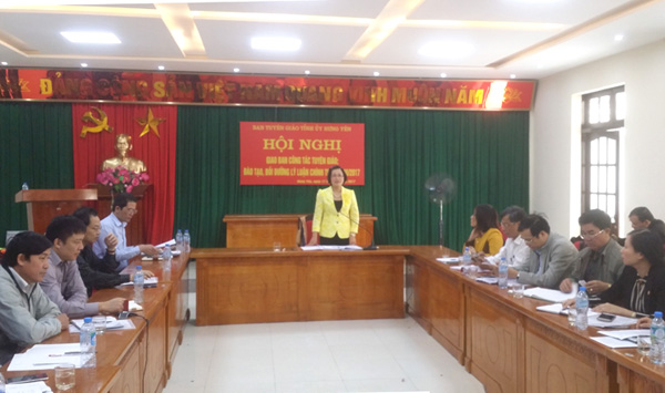 Phát biểu chỉ đạo hội nghị, đồng chí Trần Thị Thanh Thủy, Ủy viên Ban Thường vụ, Trưởng ban Tuyên giáo Tỉnh ủy đề nghị lãnh đạo các đơn vị dự hội nghị tập trung vào các nhiệm vụ trọng tâm trong quý IV do Ban Tuyên giáo Tỉnh ủy đã đề ra. Đồng thời, đề nghị Ban Tuyên giáo các cấp cần kịp thời phối hợp với các cơ quan báo chí chính thống phản ánh thông tin đúng bản chất sự việc, từ đó định hướng dư luận xã hội; ngay sau hội nghị Ban Tuyên giáo Tỉnh ủy sẽ gửi công văn gửi Sở Tài chính để tiến hành chi trả hỗ trợ cho cộng tác viên dự luận xã hội. Trong quý IV cần làm tốt công tác tham mưu quán triệt, tuyên truyền nghị quyết Trung ương 6 khóa XII của Đảng và các nhiệm vụ kinh tế, chính trị của tỉnh, đồng thời chú trọng, tập trung cao triển khai cuộc thi kể chuyện về học tập và làm theo tư tưởng, đạo đức, phong cách Hồ Chí Minh cấp tỉnh đạt kết quả cao nhất.