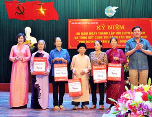 Nhân dịp này, Hội LHPN tỉnh đã tặng quà Bà mẹ Việt Nam anh hùng Phạm Thị Nhân và 2 nữ cựu thanh niên xung phong, 1 phụ nữ nghèo ở huyện Mỹ Hào. Đồng thời, tiến hành tổng kết và trao giải cuộc thi sáng tác thơ, văn xuôi với chủ đề “Phụ nữ Hưng Yên với gia đình và xã hội”. Trong tổng số 1.500 tác phẩm dự thi, có 30 tác phẩm được ban tổ chức cuộc thi chọn trao giải. Ban tổ chức cũng trao 2 giải cho các tập thể có nhiều bài dự thi và đoạt nhiều giải trong cuộc thi.