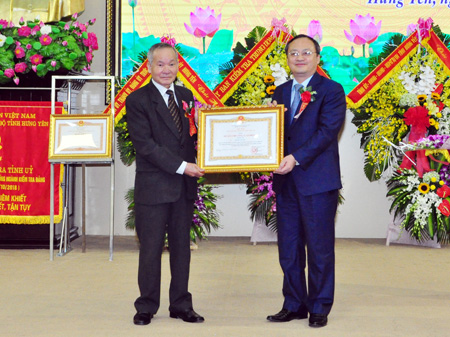 Phó Bí thư Thường trực Tỉnh ủy Đỗ Xuân Tuyên và Chủ tịch UBND tỉnh Nguyễn Văn Phóng trao Bằng khen