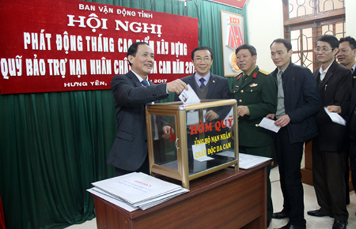 Tại hội nghị, Ban vận động xây dựng Quỹ BTNNCĐDC tỉnh đã phát động tháng cao điểm vận động xây dựng Quỹ BTNNCĐDC năm 2017 (từ ngày 20.3 – 20.4), phấn đấu toàn tỉnh thu được 4,38 tỷ đồng. Theo đó, đối tượng là cán bộ, công chức, viên chức, công nhân, người lao động hưởng lương, phụ cấp, hưu trí, mất sức ủng hộ 1 ngày lương trở lên; các hộ sản xuất, kinh doanh, dịch vụ ủng hộ 300 nghìn đồng/hộ trở lên; các hộ nông dân, dân phố ủng hộ tối thiểu 20 nghìn đồng/hộ; học sinh từ THCS trở lên và sinh viên các trường đại học, cao đẳng và trung cấp, dạy nghề ủng hộ từ 10 nghìn đồng/người trở lên.