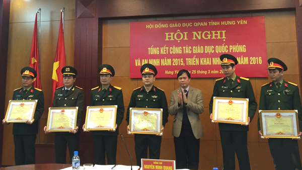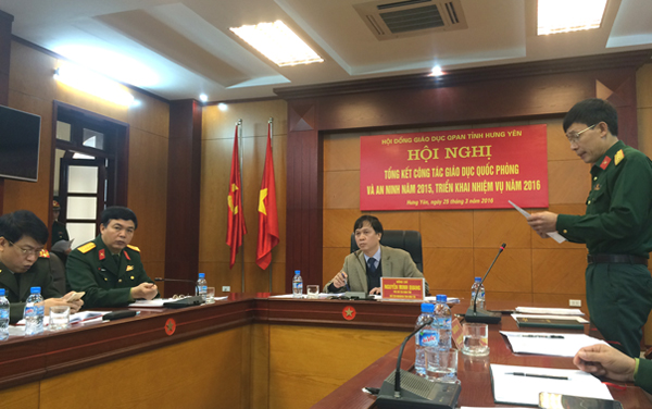 Ngày 25/03, Hội đồng Giáo dục Quốc phòng và An ninh (GDQP&AN) tỉnh Hưng Yên tổ chức Hội nghị tổng kết công tác GDQP&AN năm 2015, triển khai nhiệm vụ năm 2016. Đồng chí Nguyễn Minh Quang, TUV, Phó Chủ tịch UBND tỉnh, Chủ tịch Hội đồng GDQP&AN tỉnh chủ trì hội nghị. Tham dự hội nghị có các thành viên Hội đồng GDQP&AN tỉnh; Chủ tịch, Phó chủ tịch Thường trực Hội đồng GDQP&AN các huyện, thành phố và đại diện lãnh đạo các sở, ban, ngành, đoàn thể tỉnh.