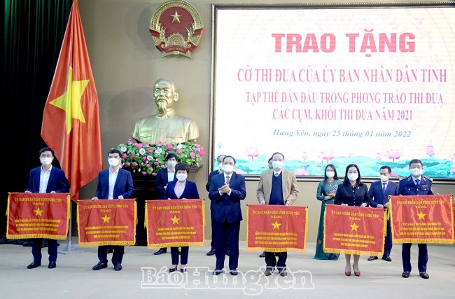 Đồng chí Trần Quốc Văn, Phó Bí thư Tỉnh uỷ, Chủ tịch UBND tỉnh trao cờ thi đua của UBND tỉnh cho các tập thể dẫn đầu phong trào thi đua các cụm, khối thi đua năm 2021