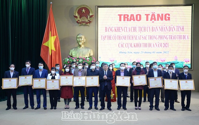 Đồng chí Nguyễn Duy Hưng, Phó Chủ tịch UBND tỉnh trao Bằng khen của Chủ tịch UBND tỉnh cho các tập thể có thành tích xuất sắc trong phong trào thi đua các cụm, khối thi đua năm 2021