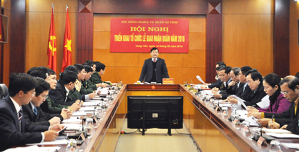 Toàn cảnh hội nghị Tại hội nghị, lãnh đạo các huyện, thành phố đã báo cáo công tác chuẩn bị cho lễ giao, nhận quân năm 2016 tại địa phương. Theo đó, toàn tỉnh đã tổ chức phát lệnh nhập ngũ cho 2.347 công dân. Công dân nhận lệnh gọi nhập ngũ cơ bản xác định rõ quyền lợi, trách nhiệm thực hiện nghĩa vụ quân sự. Các địa phương đã tổ chức bồi dưỡng nhận thức về Đảng cho đoàn viên ưu tú trúng tuyển nghĩa vụ quân sự, đồng thời tích cực tổ chức cấp phát quân trang và gặp gỡ, giao lưu, động viên các tân binh trước khi lên đường nhập ngũ.
