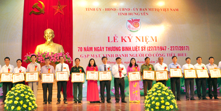Ngày 25.7, tại Trung tâm hội nghị tỉnh, Tỉnh ủy, HĐND, UBND, Ủy ban MTTQ Việt Nam tỉnh Hưng Yên trọng thể tổ chức lễ kỷ niệm 70 năm Ngày Thương binh - Liệt sỹ (27.7.1947 - 27.7.2017); gặp mặt vinh danh người có công tiêu biểu. Dự lễ kỷ niệm có các đồng chí: Đỗ Tiến Sỹ, Ủy viên BCH Trung ương Đảng, Bí thư Tỉnh ủy, Trưởng đoàn Đại biểu Quốc hội tỉnh; Nguyễn Văn Phóng, Phó Bí thư Tỉnh ủy, Chủ tịch UBND tỉnh; các vị nguyên lãnh đạo tỉnh Hưng Yên qua các thời kỳ; các đồng chí trong Ban Thường vụ Tỉnh ủy; Thường trực HĐND, lãnh đạo UBND tỉnh; Ban Thường trực Ủy ban MTTQ Việt Nam tỉnh; lãnh đạo các ban, sở, ngành, đoàn thể tỉnh, các huyện, thành phố; đại diện Bà mẹ Việt Nam anh hùng, người có công (NCC) trên địa bàn tỉnh...