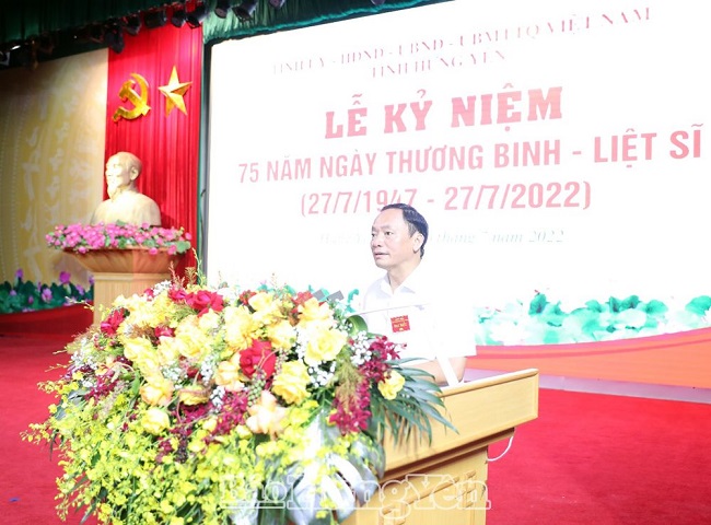Tại lễ kỷ niệm, đồng chí Trần Quốc Văn, Phó Bí thư Tỉnh ủy, Chủ tịch UBND tỉnh trình bày diễn văn ôn lại truyền thống đấu tranh quật cường của dân tộc để bảo vệ độc lập, tự do của Tổ quốc; sự đóng góp của quân và dân tỉnh Hưng Yên trong các cuộc đấu tranh giải phóng dân tộc, bảo vệ Tổ quốc và ý nghĩa của ngày Thương binh - Liệt sĩ (27.7).