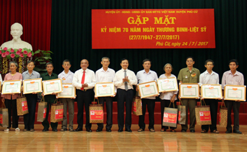 Nhân dịp này, 3 tập thể, 3 cá nhân của huyện được Sở Lao động, Thương binh và Xã hội khen thưởng về thành tích xuất sắc trong các phong trào “Uống nước nhớ nguồn”, “Đền ơn đáp nghĩa”; 30 người có công, thân nhân liệt sỹ và 7 tập thể, 7 cá nhân có thành tích trong thực hiện chế độ, chính sách đối với người có công năm 2017 được UBND huyện khen thưởng.