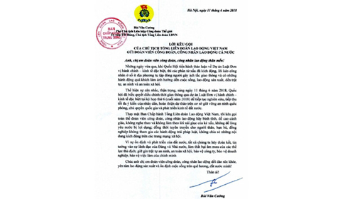 Lời kêu gọi nêu rõ, những ngày qua, khi Quốc hội tiến hành thảo luận về Dự án Luật Đơn vị hành chính - kinh tế đặc biệt, thì các thành phần xấu đã kích động, lôi kéo công nhân ở một số ít địa phương tụ tập đông người, gây ách tắc giao thông và có những hành động quá khích, làm ảnh hưởng đến cuộc sống, sản xuất, trật tự, an ninh và an toàn xã hội.