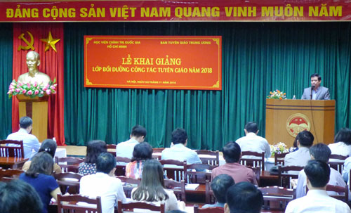 Chiều ngày 3/12, tại Hà Nội, Học viện Chính trị quốc gia Hồ Chí Minh phối hợp với Ban Tuyên giáo Trung ương tổ chức lớp Bồi dưỡng công tác Tuyên giáo năm 2018 cho 100 đồng chí là các trưởng, phó ban tuyên giáo các tỉnh, thành ủy, bộ, ban, ngành trực thuộc Trung ương và tương đương năm 2018.