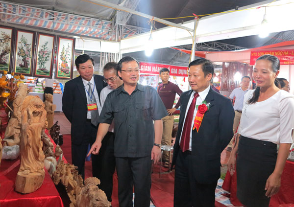 Đồng chí Đỗ Tiến Sỹ, Bí thư Tỉnh ủy cùng các đồng chí lãnh đạo tỉnh tham quan các gian hàng tại Hội chợ