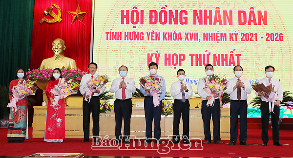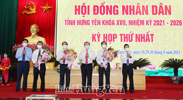 Các đồng chí: Đỗ Tiến Sỹ, Ủy viên BCH Trung ương Đảng, Tổng Giám đốc Đài Tiếng nói Việt Nam, Bí thư Tỉnh ủy khóa XIX, Trưởng đoàn đại biểu Quốc hội tỉnh khóa XIV; Nguyễn Duy Hưng, Phó Bí thư Thường trực Tỉnh ủy; Trần Quốc Toản, Phó Bí thư Tỉnh ủy, Chủ tịch HĐND tỉnh tặng hoa chúc mừng các đồng chí được bầu giữ các chức danh của UBND tỉnh