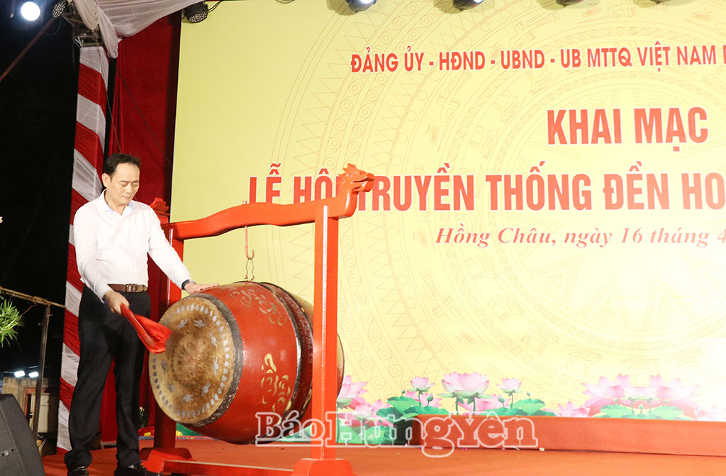 Lãnh đạo phường Hồng Châu thực hiện nghi thức đánh trống khai hội.