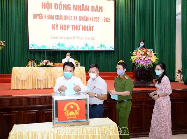 Các đại biểu bỏ phiếu bầu các chức danh của HĐND huyện Khoái Châu nhiệm kỳ 2021 - 2026