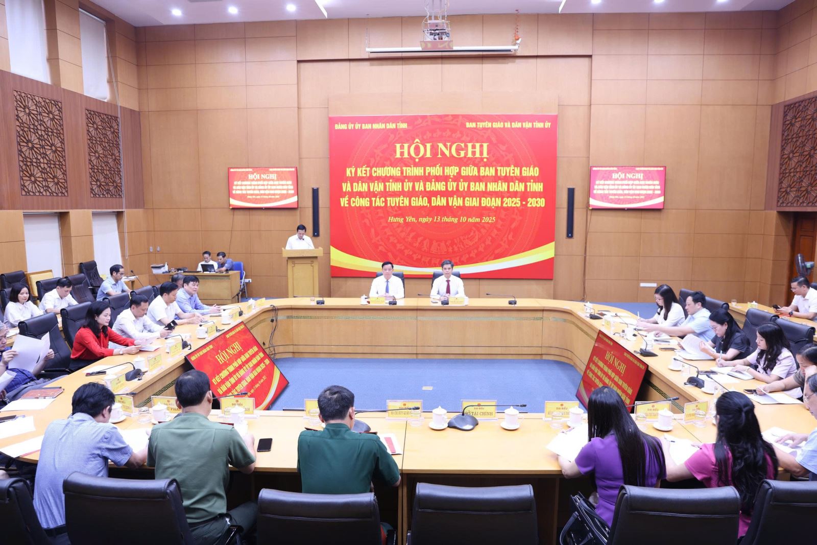 Tại hội nghị, các đại biểu tập trung thảo luận, thống nhất ký kết chương trình phối hợp về công tác tuyên giáo, dân vận giai đoạn 2025 - 2030 gồm các nội dung: Tham mưu với Tỉnh ủy trong lãnh đạo, chỉ đạo, quán triệt, triển khai và tổ chức thực hiện các chủ trương, đường lối của Đảng, chính sách, pháp luật của Nhà nước và của địa phương về công tác tuyên giáo và dân vận; phối hợp trong việc thực thi pháp luật, triển khai kế hoạch phát triển kinh tế - xã hội, giải quyết các vấn đề nổi cộm Nhân dân quan tâm cũng như việc thực hiện dân chủ ở cơ sở; phối hợp tổ chức họp báo, thống nhất nội dung phát ngôn, cung cấp thông tin cho các cơ quan báo chí; biên soạn, phát hành tài liệu tuyên truyền, định hướng thông tin, dư luận xã hội; đấu tranh phản bác quan điểm sai trái, thù địch, thông tin giả, thông tin xuyên tạc, sai sự thật về đường lối, chủ trương của Đảng, chính sách, pháp luật của Nhà nước; phối hợp đẩy mạnh cải cách hành chính; tham mưu tổ chức các cuộc tiếp xúc đối thoại trực tiếp của người đứng đầu cấp ủy, chính quyền các cấp với Nhân dân; đẩy mạnh các phong trào thi đua yêu nước và các cuộc vận động; tạo điều kiện để Mặt trận Tổ quốc, các tổ chức chính trị - xã hội và Nhân dân tham gia quản lý nhà nước, quản lý xã hội, góp ý xây dựng Đảng, xây dựng chính quyền; tham mưu lãnh đạo, chỉ đạo tăng cường công tác quản lý nhà nước về công tác tín ngưỡng, tôn giáo, dân tộc…