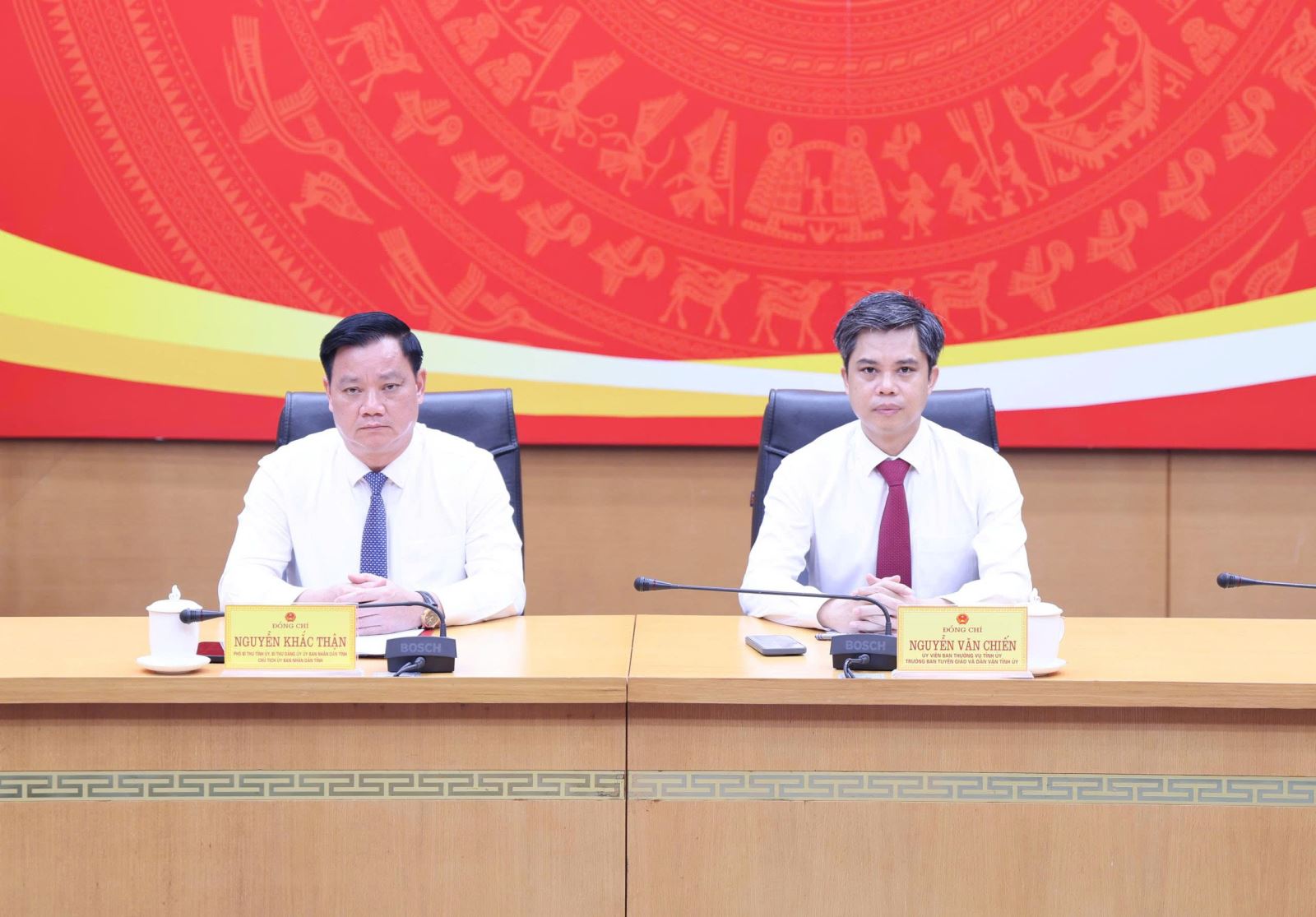 Đồng chí Chủ tịch UBND tỉnh Nguyễn Khắc Thận và đồng chí Nguyễn Văn Chiến, Trưởng ban Tuyên giáo và Dân vận Tỉnh ủy chủ trì hội nghị.