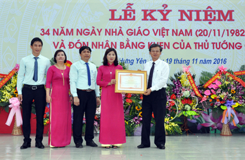 * Ngày 19.11, Phó Chủ tịch UBND tỉnh Nguyễn Duy Hưng đến chúc mừng cán bộ, giáo viên, nhân viên và trao bằng khen của Thủ tướng Chính phủ tặng Trường THPT Chuyên Hưng Yên.