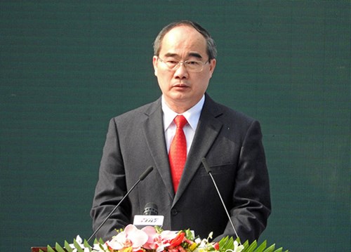 Thay mặt lãnh đạo Đảng, Nhà nước, MTTQ Việt Nam, Bí thư Thành ủy TPHCM Nguyễn Thiện Nhân đọc diễn văn tại buổi lễ