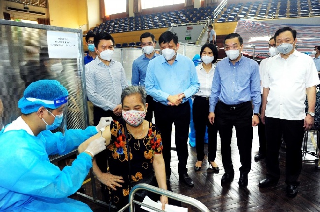 Ủy viên Trung ương Đảng, Chủ tịch Ủy ban nhân dân thành phố Hà Nội Chu Ngọc Anh và Ủy viên Trung ương Đảng, Bộ trưởng Bộ Y tế Nguyễn Thanh Long kiểm tra công tác tổ chức tiêm chủng tại Nhà thi đấu Trịnh Hoài Đức, Hà Nội_Nguồn: tuoitrethudo.com.vn