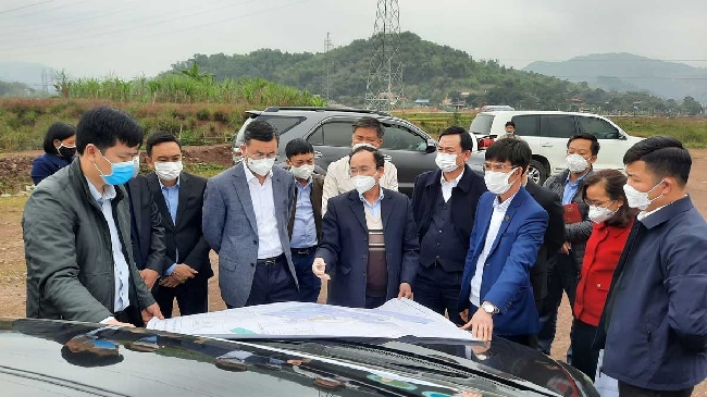 Ủy viên Trung ương Đảng, Bí thư Tỉnh ủy Hòa Bình Ngô Văn Tuấn kiểm tra công tác giải phóng mặt bằng khu công nghiệp Mông Hóa, tỉnh Hòa Bình_ Ảnh: baohoabinh.com.vn