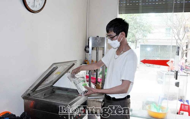 Ông Đỗ Văn Chuyên, thôn Trai Trang dán tem nhãn cho sản phẩm giò của gia đình