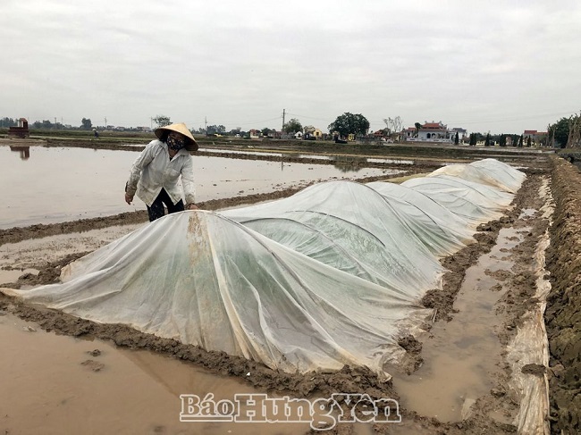 Nông dân xã Bắc Sơn (Ân Thi) che phủ nilon chống rét cho mạ xuân