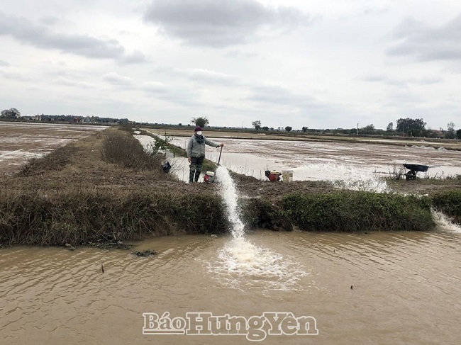 Một số diện tích lúa gieo thẳng tại huyện Phù Cừ bị ngập do ảnh hưởng của mưa rào các ngày 19 và 20.2 được nông dân chủ động bơm gạn