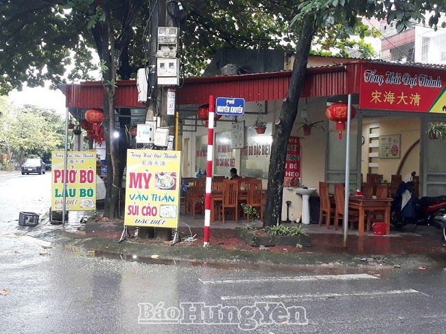 Hàng quán được lợp mái tôn chắc chắn chắn ngang lối đi trên vỉa hè tại đường Ngô Tất Tố (thành phố Hưng Yên)
