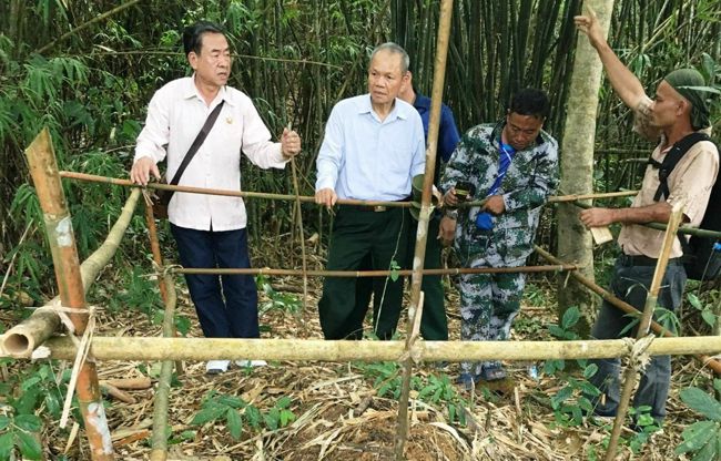 Trung tướng Hoàng Khánh Hưng (áo trắng đứng giữa) tìm kiếm mộ liệt sỹ tại Lào. (Ảnh nhân vật cung cấp)