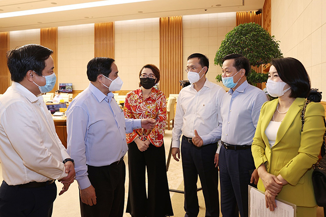 Ủy viên Bộ Chính trị, Thủ tướng Chính phủ Phạm Minh Chính với các đại biểu dự Hội nghị trực tuyến Chính phủ với doanh nghiệp, hiệp hội doanh nghiệp và các địa phương nhằm tìm giải pháp tháo gỡ khó khăn, thúc đẩy sản xuất, kinh doanh trong bối cảnh dịch COVID-19, ngày 8-8-2021 _Ảnh: TTXVN