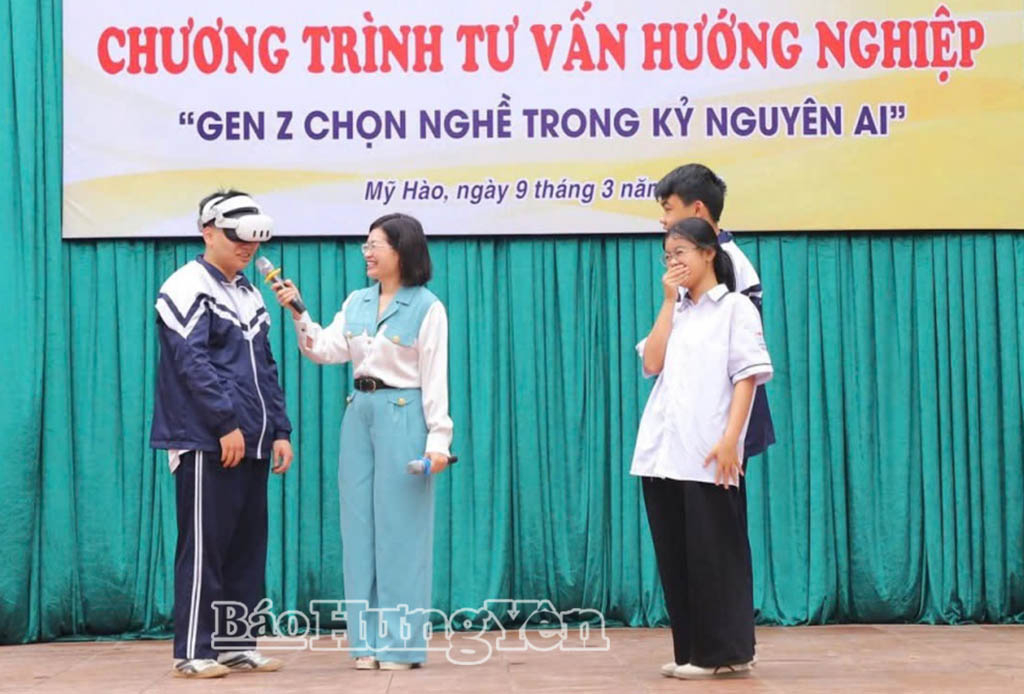 Học sinh Trường THPT Mỹ Hào (phường Mỹ Hào) tham gia giao lưu, hỏi - đáp về trí tuệ nhân tạo (AI) tại chương trình tư vấn hướng nghiệp.