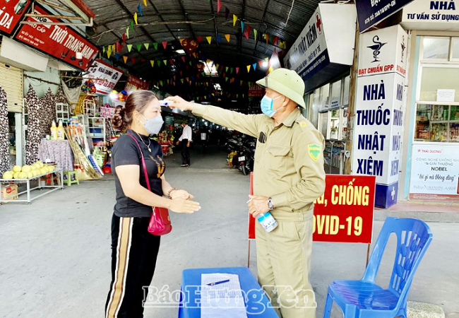Người dân đo thân nhiệt, khai báo y tế trước khi vào chợ Gạo (thành phố Hưng Yên)