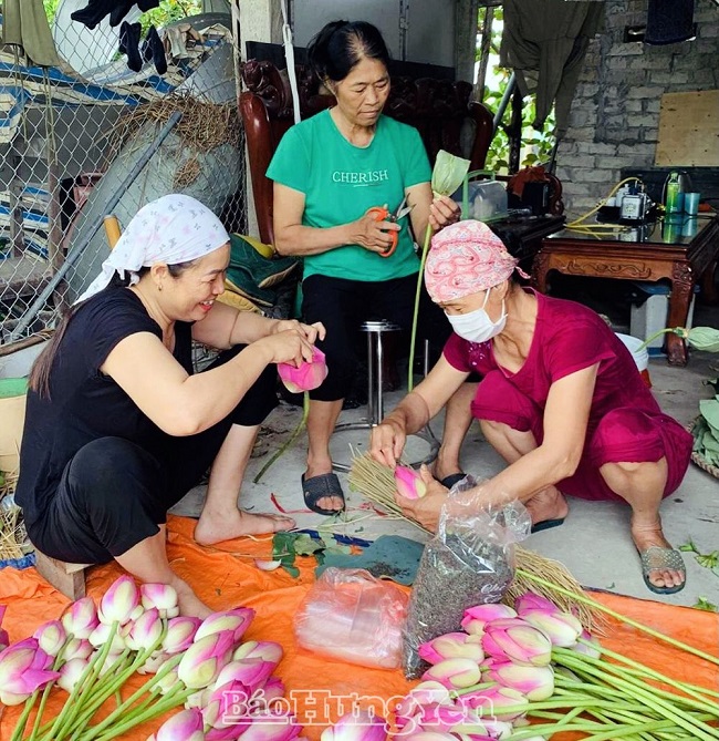 Chị Bùi Thị Kim Hương, Chủ tịch Hội LHPN xã cho biết: “Qua khảo sát tại các chi hội hiện còn 30 hội viên phụ nữ thuộc diện hộ nghèo và cận nghèo, có hoàn cảnh khó khăn cùng với 11 trẻ em mồ côi cha, mẹ hoặc cả cha và mẹ. Để góp phần chia sẻ khó khăn, động viên và giúp đỡ chị em cùng các cháu ổn định cuộc sống, Hội LHPN xã triển khai hoạt động ướp trà sen bán để gây quỹ. Hoa sen chúng tôi thu mua từ hộ gia đình hội viên, nhân lực huy động các cán bộ, hội viên trong toàn xã tham gia góp ngày công”. Để làm ra được sản phẩm trà sen có chất lượng, công thức ướp trà được chị em nghiên cứu, tìm hiểu qua sách, báo và mạng Internet. Chị Đỗ Thị Uyên, hội viên trực tiếp thực hiện cho biết: Hoa sen được hái từ sáng sớm, sau đó sẽ tách riêng phần gạo sen ra để lấy nguyên liệu ướp trà. Trà xanh được ướp với gạo sen theo tỷ lệ rồi bỏ vào bông sen, dùng lá sen bọc chặt bên ngoài. Bông sen sau khi bọc trà sẽ được cắm một đêm để hương thơm thấm đều vào trà. Khi khách mua chúng tôi sẽ đóng gói nilon và hút chân không để bảo quản được lâu hơn.