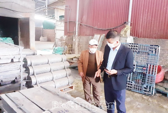 Cán bộ Sở TN&MT kiểm tra việc chấp hành các quy định của pháp luật về bảo vệ môi trường tại các cơ sở sản xuất ở xã Chỉ Đạo (Văn Lâm)