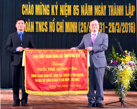 Bí thư Tỉnh ủy Đỗ Tiến Sỹ trao tặng bức trướng của BCH Đảng bộ tỉnh cho tuổi trẻ Hưng Yên