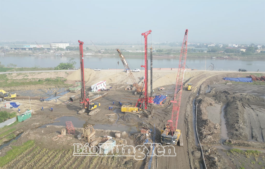 Thi công cầu vượt sông Trà Lý thuộc tuyến đường từ phường Thái Bình kết nối với phường Phố Hiến.