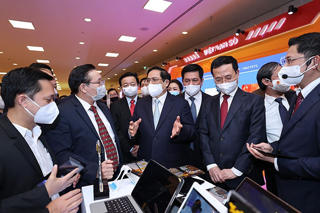 Ủy viên Bộ Chính trị, Thủ tướng Chính phủ Phạm Minh Chính tham quan gian trưng bày sản phẩm công nghệ số của các doanh nghiệp tham dự Diễn đàn quốc gia Phát triển doanh nghiệp công nghệ số lần thứ 3, năm 2021 _ Ảnh: TTXVN