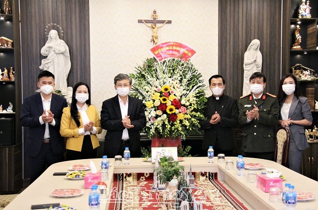 Đồng chí Nguyễn Duy Hưng, Phó Chủ tịch UBND tỉnh, Phó trưởng Ban Chỉ đạo công tác Tôn giáo tỉnh trao hoa, quà của Tỉnh uỷ, HĐND, UBND, Uỷ ban MTTQ Việt Nam tỉnh và Ban Chỉ đạo công tác Tôn giáo tỉnh tặng Linh mục Nguyễn Văn Tuyên; chúc Linh mục Nguyễn Văn Tuyên và các chức sắc, đồng bào công giáo ở giáo xứ thành phố Hưng Yên đón một mùa Giáng sinh 2021 an lành, hạnh phúc.