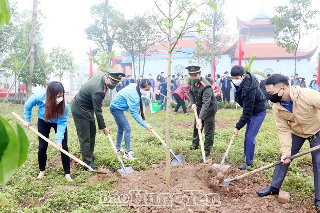 Các đại biểu và ĐVTN tham gia trồng cây trong Lễ khởi động Tháng Thanh niên năm 2022 tại Đền thờ Triệu Việt Vương, xã Dạ Trạch (Khoái Châu)