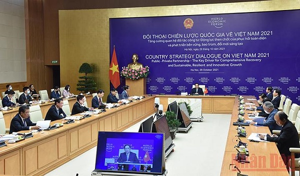 Phát biểu mở đầu đối thoại, Giáo sư Klaus Schwab nhấn mạnh, Việt Nam triển khai nhanh chóng và quyết liệt chiến lược tiêm chủng. Đây là tín hiệu tích cực cho thấy khó khăn do đại dịch gây ra sẽ sớm vượt qua, Việt Nam sẽ duy trì đà phát triển ấn tượng, vững bước trên con đường trở thành đầu tàu kinh tế của khu vực.