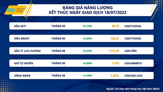 Giá dầu tăng rất mạnh trong phiên giao dịch ngày hôm qua nhờ Dollar Index giảm giá. Đối với dầu WTI, hợp đồng giao tháng 7 đã đến ngày giao dịch cuối cùng, và thị trường đã chuyển sang hợp đồng giao tháng 8. Kết thúc phiên giao dịch, giá WTI tăng 5,13% lên 99,42 USD/thùng trong khi giá dầu Brent tăng 5,05% lên 106,27 USD/thùng.