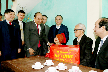 Nhân dịp này, tại Trụ sở Tỉnh ủy, Thủ tướng Chính phủ Nguyễn Xuân Phúc đã trao quà tặng các đối tượng chính sách dịp xuân Kỷ Hợi 2019. Thủ tướng và Ðoàn công tác đã đến thăm và tặng quà Bà mẹ Việt Nam Anh hùng Nguyễn Thị Hơn ở thôn Tượng Cước, xã Xuân Trúc (Ân Thi).