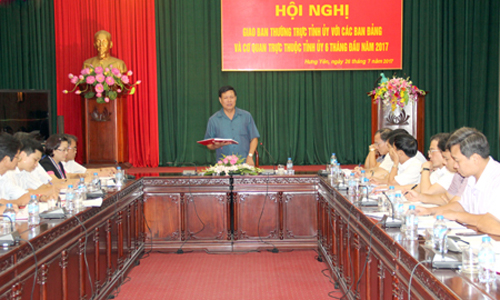 Ngày 26.7, Thường trực Tỉnh ủy đã tổ chức hội nghị giao ban với các ban Đảng và cơ quan trực thuộc Tỉnh ủy nhằm đánh giá kết quả thực hiện nhiệm vụ 6 tháng đầu năm, triển khai thực hiện nhiệm vụ 6 tháng cuối năm. Đồng chí Đỗ Xuân Tuyên, Phó Bí thư Thường trực Tỉnh ủy, Chủ tịch HĐND tỉnh chủ trì hội nghị. Dự hội nghị có các vị trong Ban Thường vụ Tỉnh ủy, Thường trực HĐND tỉnh.