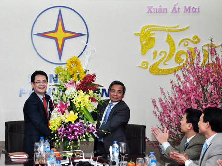 | Chủ tịch UBND tỉnh Doãn Thế Cường tặng hoa chúc mừng cán bộ, nhân viên Công ty Điện lực Hưng Yên |