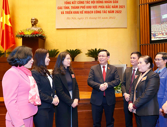 Ủy viên Bộ Chính trị, Chủ tịch Quốc hội Vương Đình Huệ cùng các đại biểu dự Hội nghị tổng kết công tác hội đồng nhân dân các tỉnh, thành phố khu vực phía Bắc _Ảnh: TTXVN