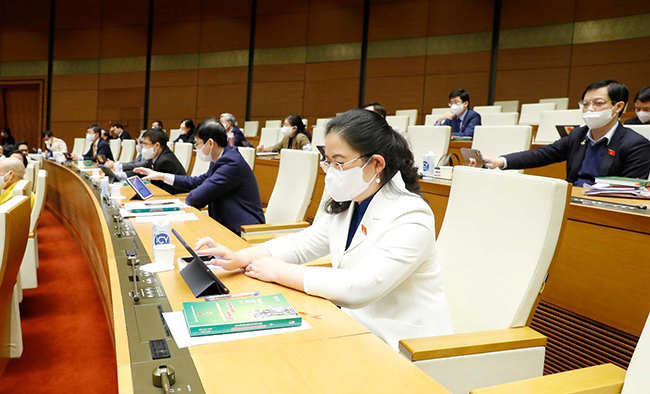 Đại biểu Quốc hội biểu quyết thông qua nghị quyết về chính sách tài khoá, tiền tệ để hỗ trợ Chương trình phục hội và phát triển kinh tế - xã hội tại Kỳ họp bất thường lần thứ nhất, Quốc hội khoá XV _Ảnh: TTXVN