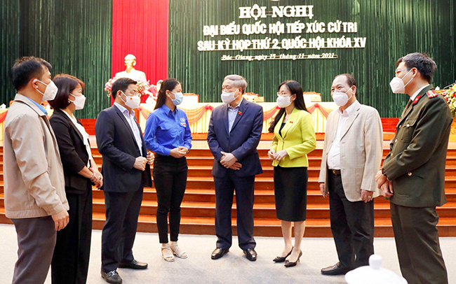 Ủy viên Bộ Chính trị, Bí thư Trung ương Đảng, Chánh án Tòa án nhân dân tối cao Nguyễn Hòa Bình cùng Đoàn đại biểu Quốc hội tỉnh Bắc Giang tiếp xúc cử tri trên địa bàn tỉnh _Ảnh: TTXVN