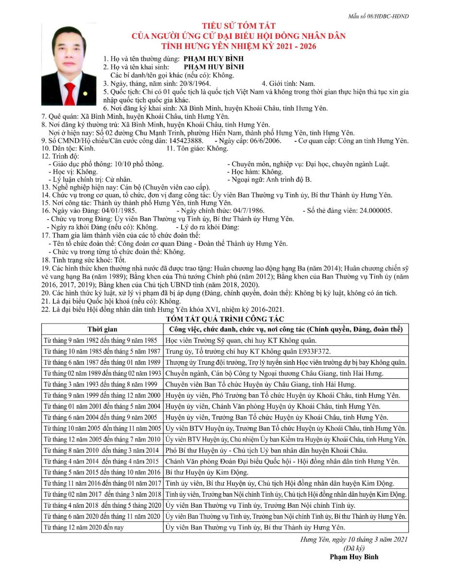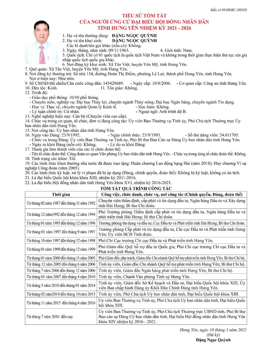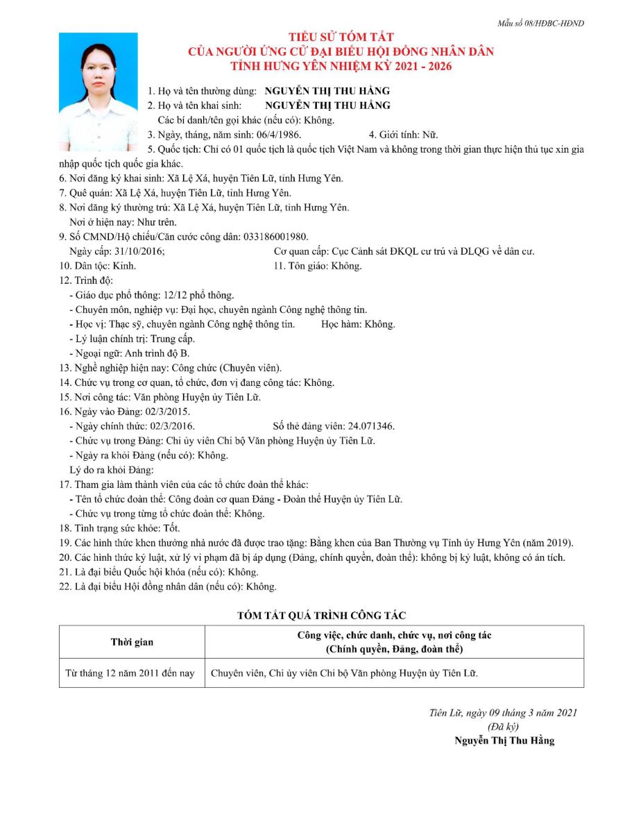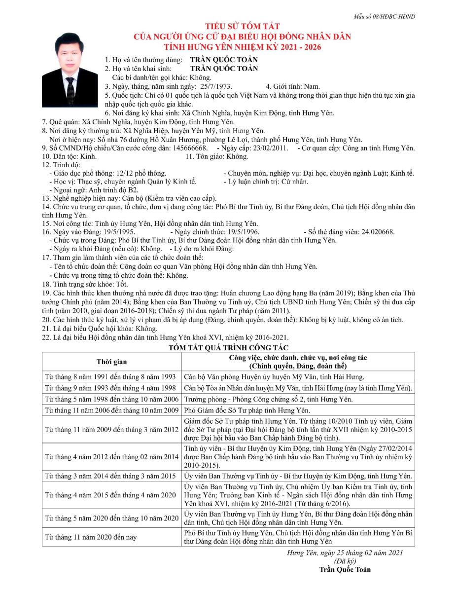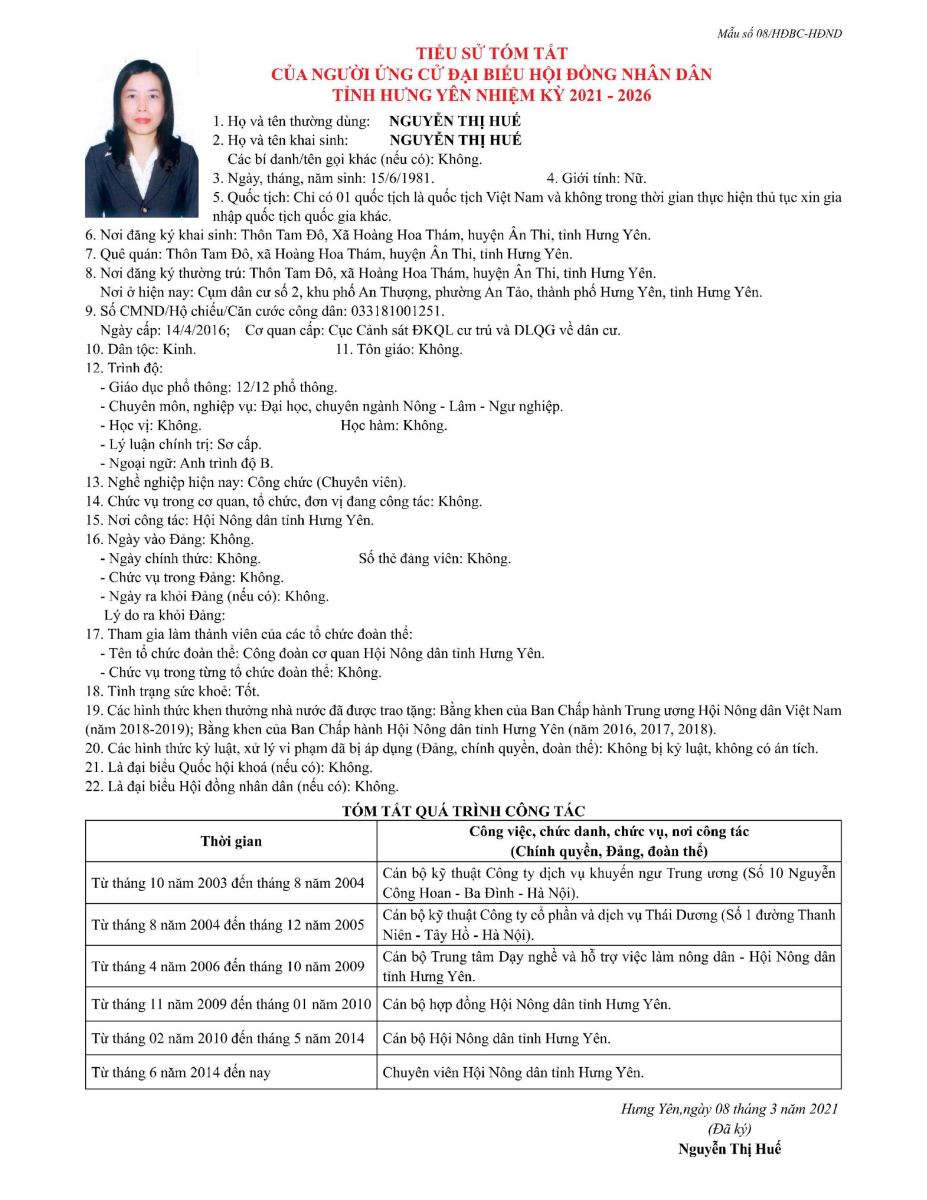 TIỂU SỬ TÓM TẮT CỦA NGƯỜI ỨNG CỬ ĐẠI BIỂU HĐND TỈNH HƯNG YÊN NHIỆM KỲ 2021-2026