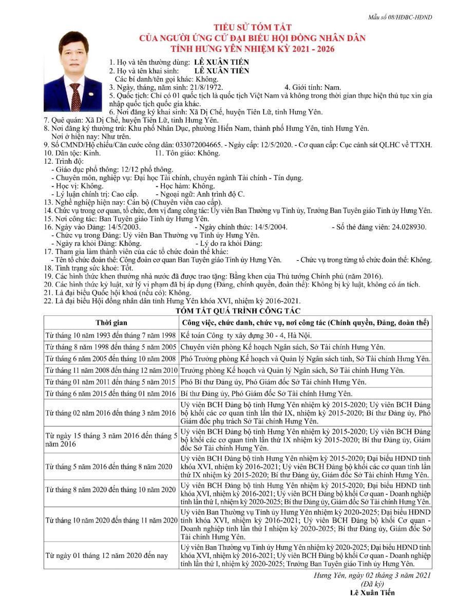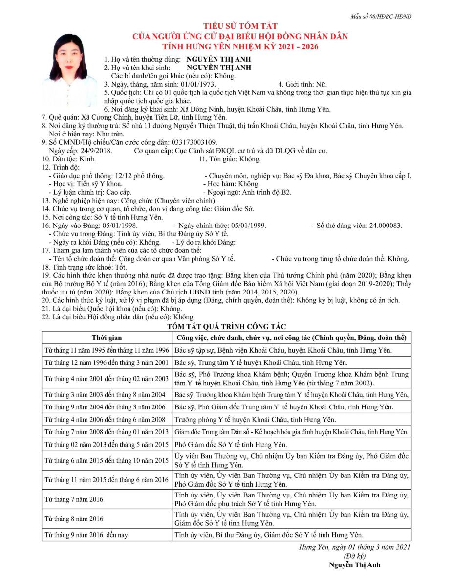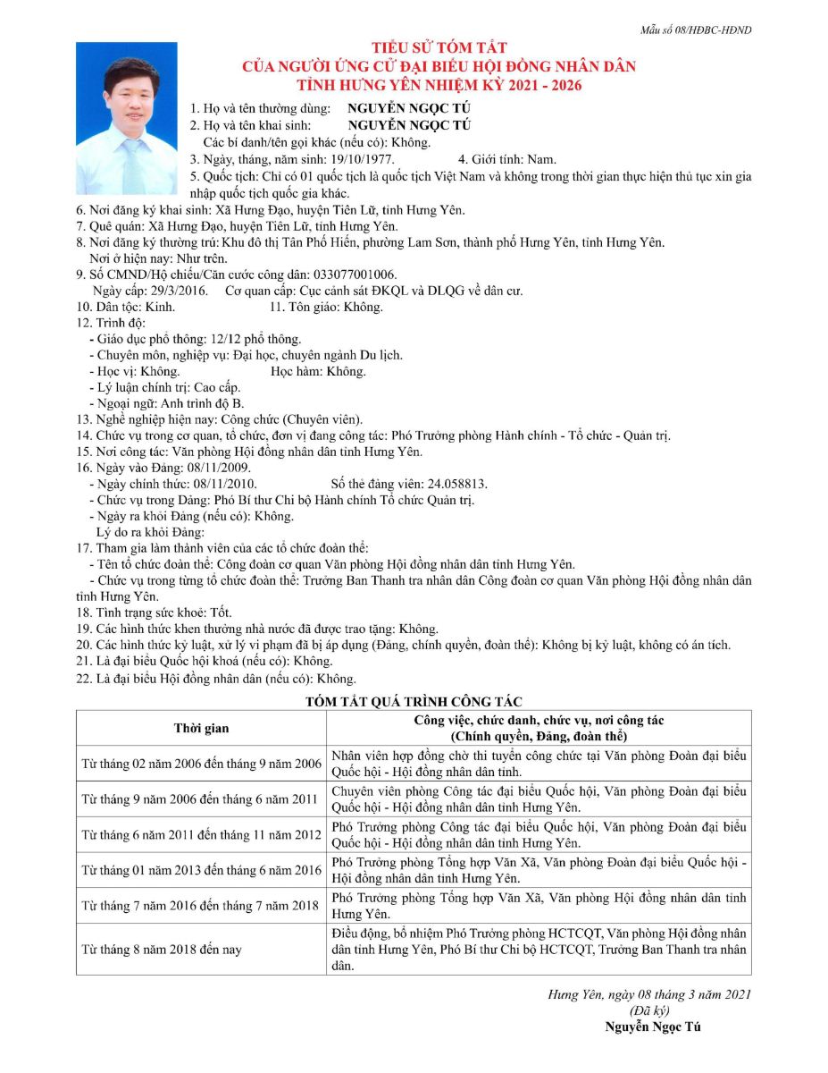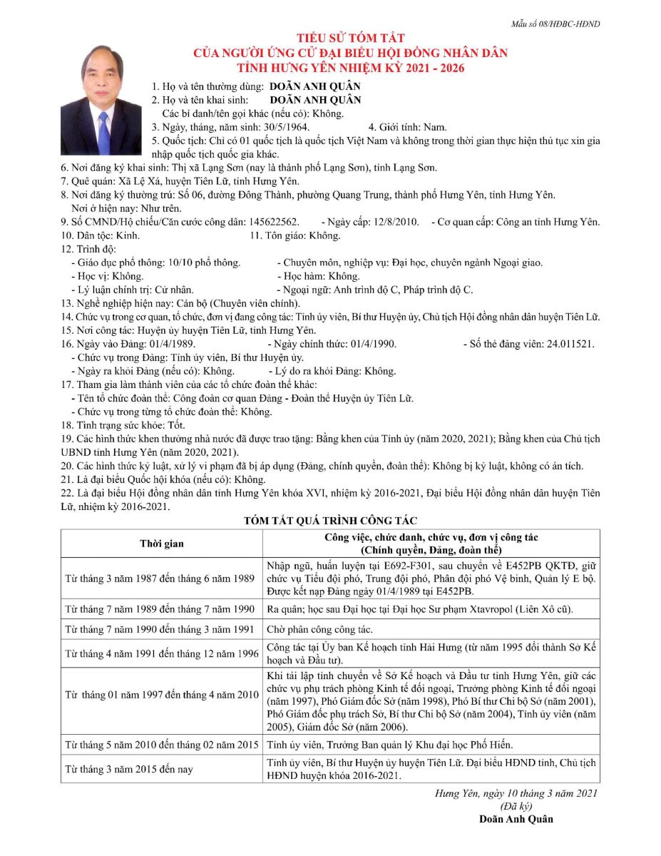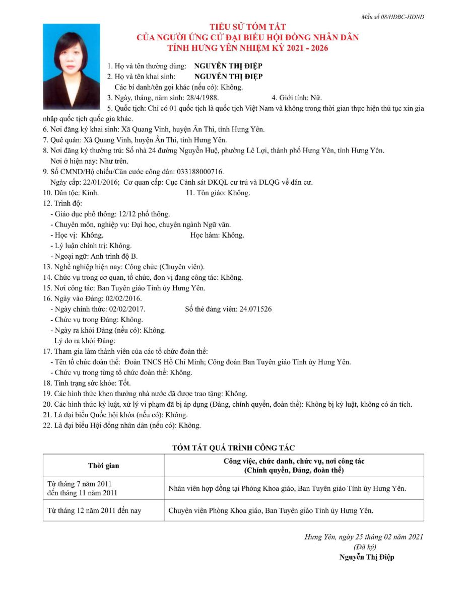 TIỂU SỬ TÓM TẮT CỦA NGƯỜI ỨNG CỬ ĐẠI BIỂU HĐND TỈNH HƯNG YÊN NHIỆM KỲ 2021-2026