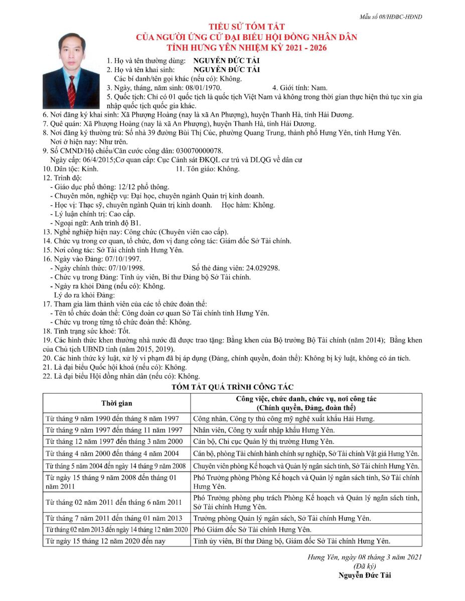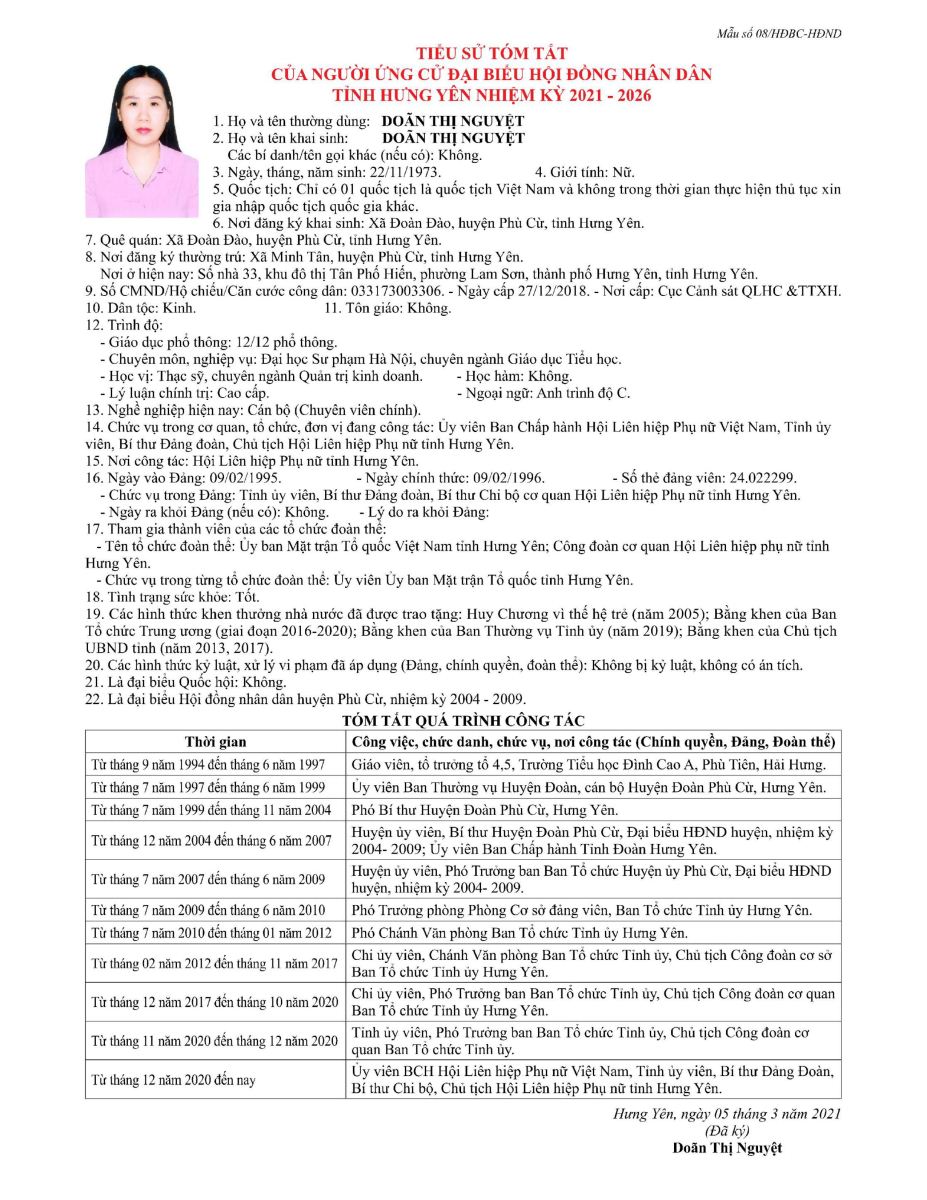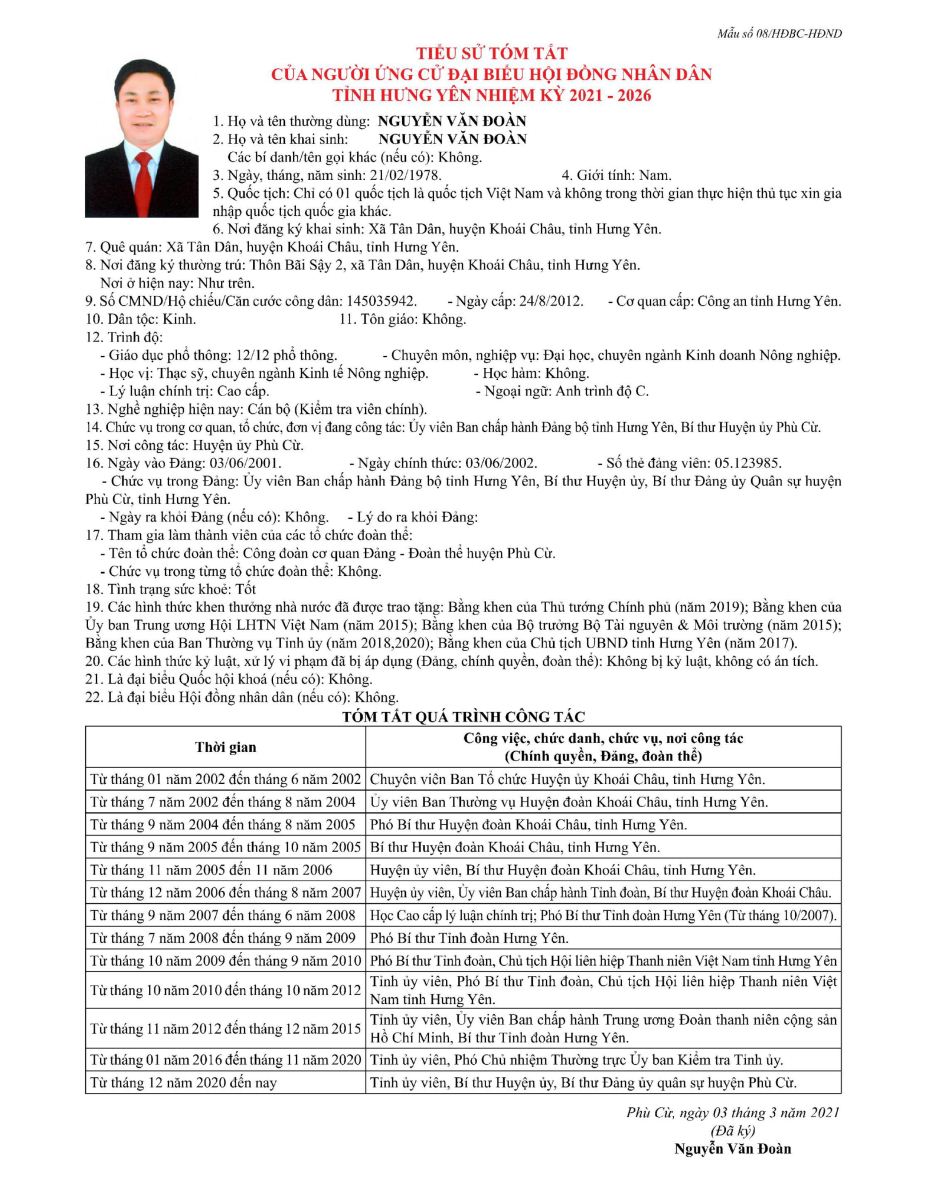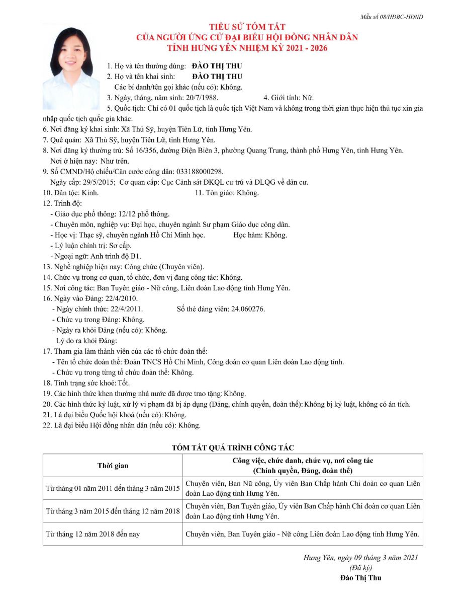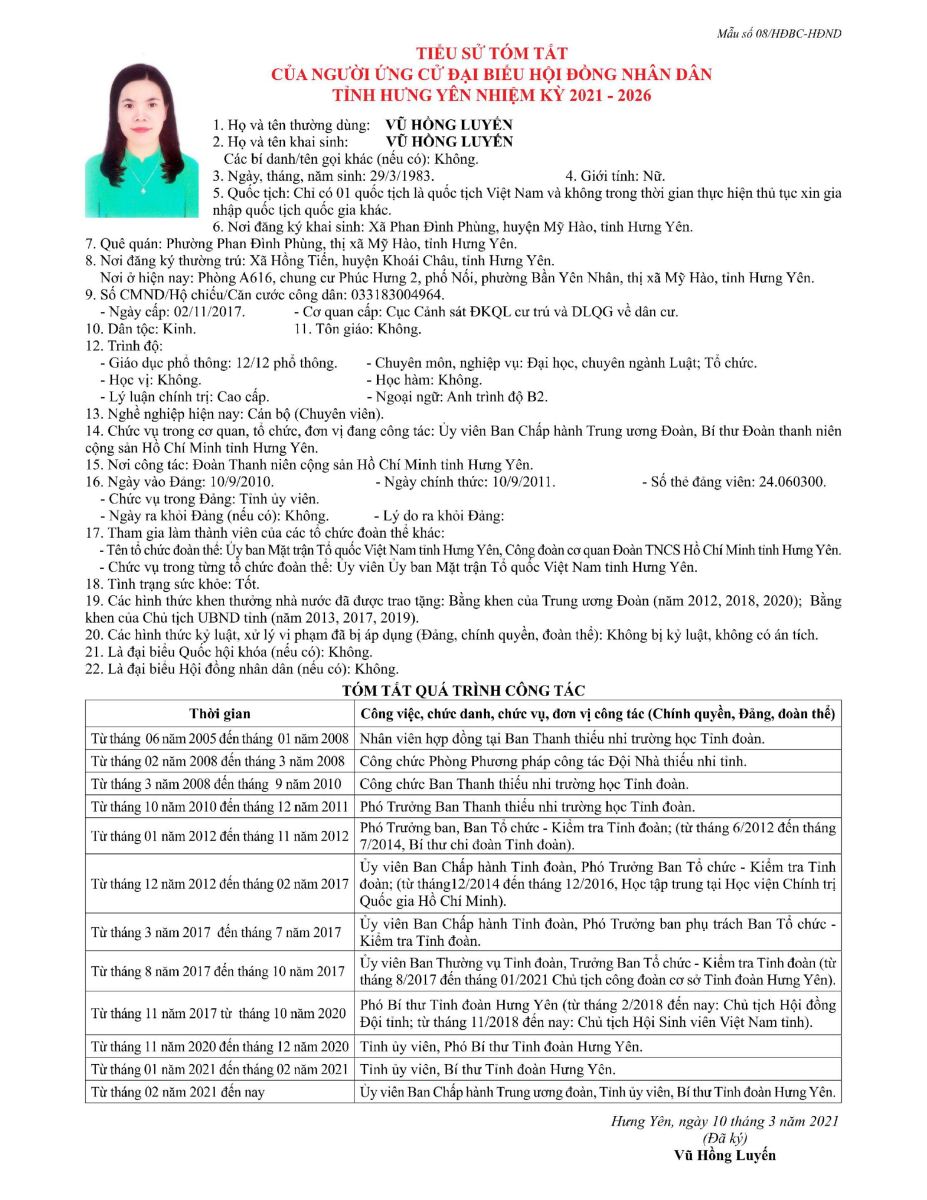 TIỂU SỬ TÓM TẮT CỦA NGƯỜI ỨNG CỬ ĐẠI BIỂU HĐND TỈNH HƯNG YÊN NHIỆM KỲ 2021-2026
